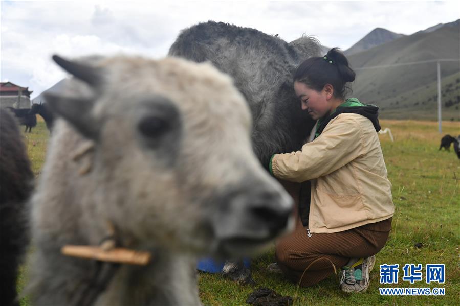 9月8日,在四川省康定市呷巴乡俄达门巴村附近,一名藏族姑娘给牦牛挤奶。新华社记者孙瑞博摄