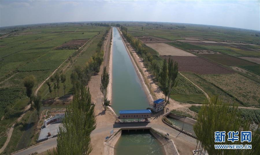 9月4日无人机拍摄的河套灌区杨家河干渠第二节制闸。 新华社记者 刘诗平 摄