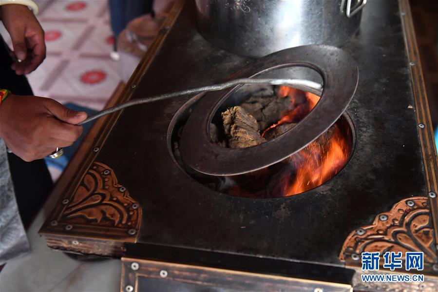在青海省玉树藏族自治州治多县治渠乡同卡村,村民布沙措江卓玛给家中的炉子添加燃料——牛粪(9月12日摄)。在当地,清洁环保的牛粪依然是不少牧民选用的主要燃料。新华社记者 孙瑞博 摄