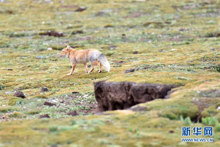 在青海省玉树藏族自治州治多县,一只藏狐雨后“漫步”在草场上(9月12日摄)。 新华社记者 孙瑞博 摄