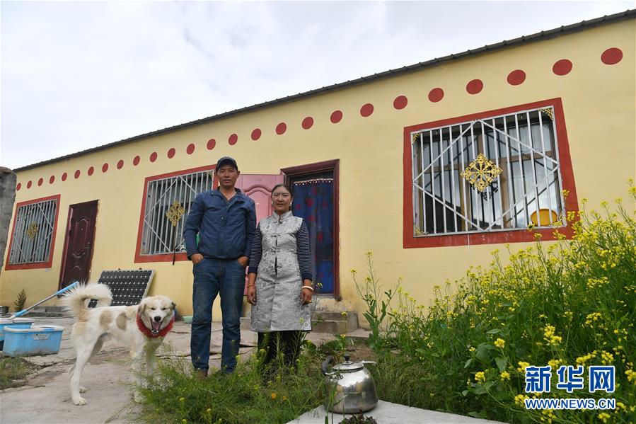 在青海省玉树藏族自治州治多县治渠乡同卡村,村民昂文西让和妻子布沙措江卓玛站在易地搬迁的新家院子里合影(9月12日摄)。新华社记者 孙瑞博 摄