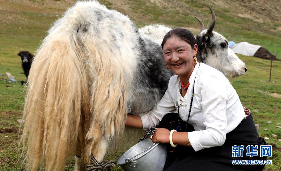 在青海省玉树藏族自治州治多县治渠乡同卡村,村民昂文西让的妻子布沙措江卓玛正在挤牛奶(9月12日摄)。新华社记者 韩方方 摄