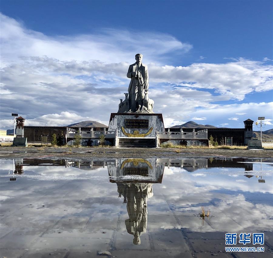这是在青海省玉树藏族自治州治多县用手机拍摄的“环保卫士”杰桑·索南达杰的雕像(9月12日摄)。新华社记者 邹乐 摄