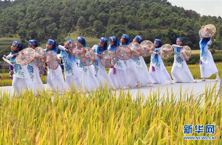 9月15日,孩子们在田野里表演舞蹈《丰收麦田》。 金秋时节,云南省寻甸回族彝族自治县在七星镇鲁古村举行庆祝丰收活动。 新华社记者 杨宗友 摄
