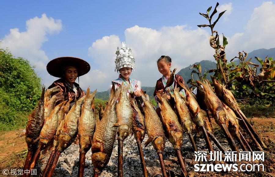 广西柳州市融水县山区有插秧时节放养鲤鱼苗的习俗,金秋时节稻熟鱼肥,收稻烧鱼成为别致一景。