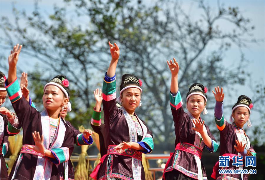 10月28日,在广西融水苗族自治县拱洞乡龙令村,侗族妇女在表演歌舞。新华社记者 黄孝邦 摄