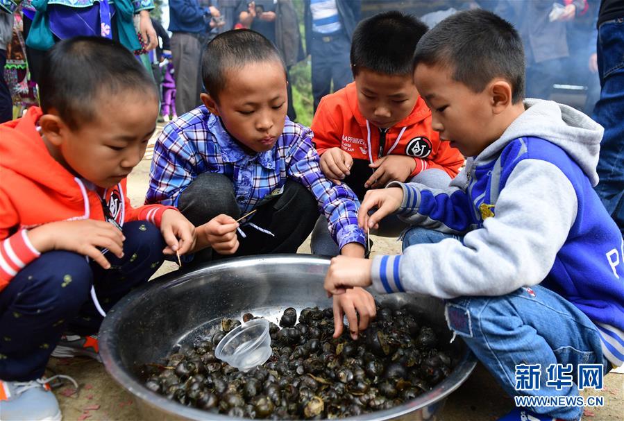 10月28日,在广西融水苗族自治县拱洞乡龙令村,小朋友在品尝田螺。新华社记者 黄孝邦 摄