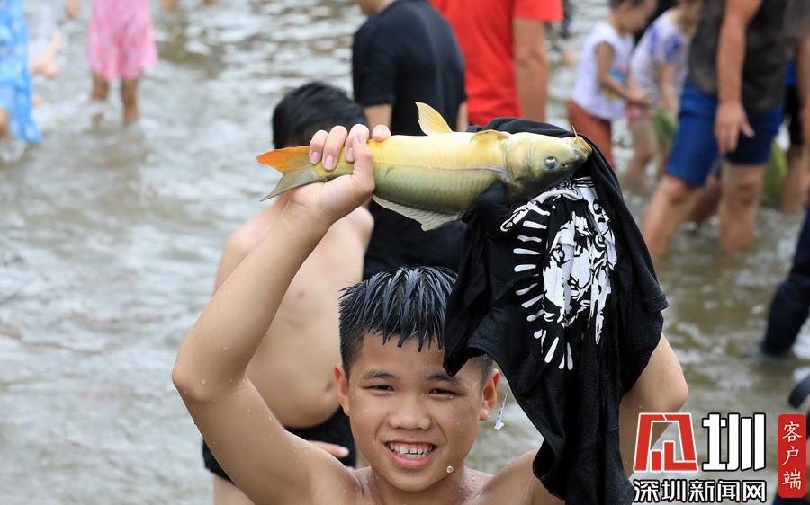 一名小朋友在“闹鱼”活动中抓得一条活鱼。