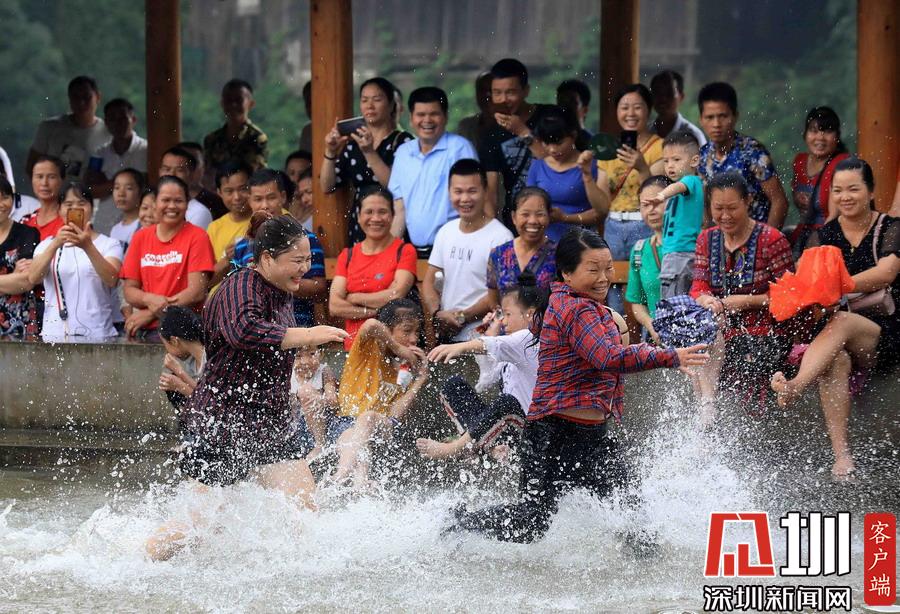 在广西柳州市融安县长安镇安宁村大袍屯,人们在水上篮球比赛中拼抢。
