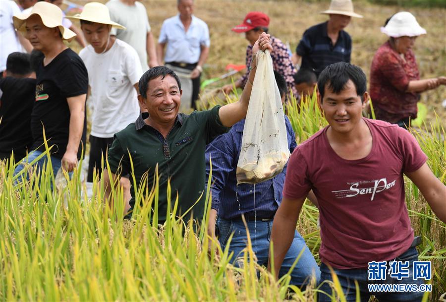 9月15日,人们在稻田里参加摸鱼比赛。 新华社记者 杨宗友 摄