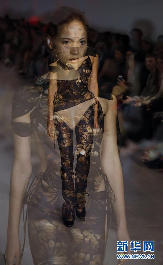 9月17日,在英国伦敦,模特在2020伦敦春夏时装周上展示Charlotte Knowles品牌服饰(多重曝光)。 当日,2020伦敦春夏时装周落幕。 新华社记者 韩岩 摄