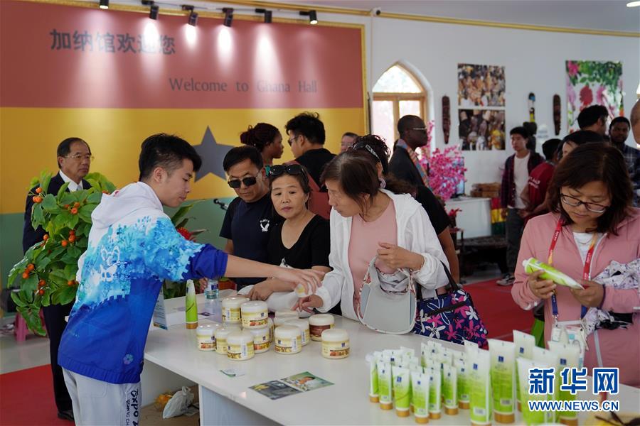 9月18日,参观者在北京世园会加纳馆内选购商品。 当日,2019年中国北京世界园艺博览会“加纳国家日”活动在北京世园会园区举行。 新华社记者 鞠焕宗 摄