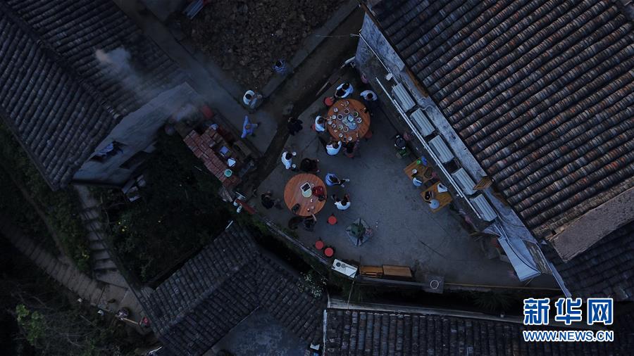 游客在木梨硔村吃早点(9月18日无人机拍摄)。新华社记者张端摄