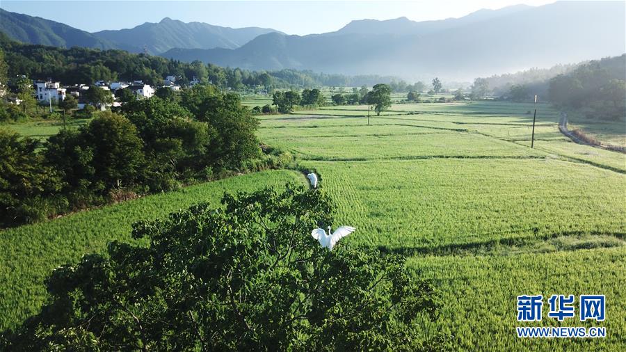 这是8月4日无人机拍摄的安徽黟县宏村风景区附近的农田晨景。新华社记者张端摄