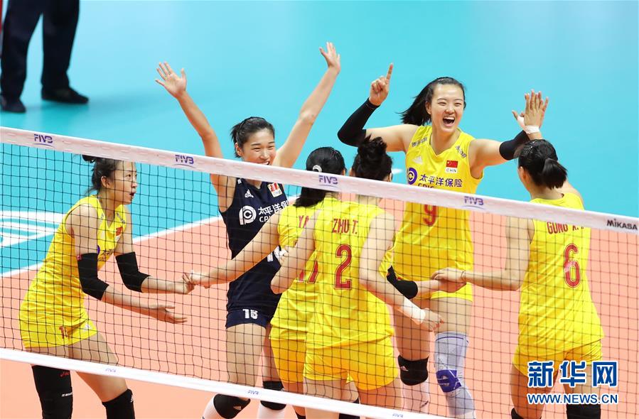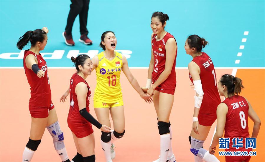 9月23日,中国队球员在比赛中庆祝得分。当日,在日本札幌举行的2019年女排世界杯赛第二阶段A组循环赛中,中国队以3比0战胜美国队。新华社记者杜潇逸摄