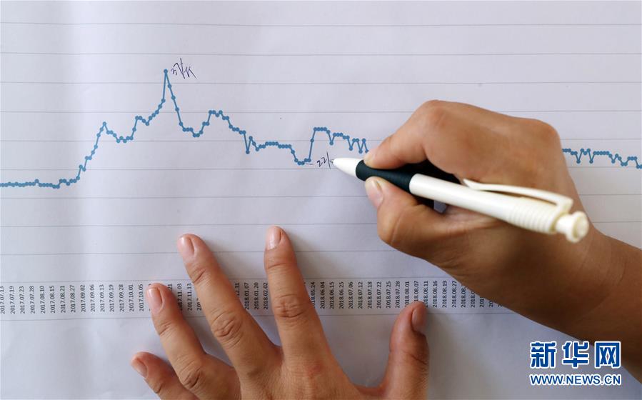郭旗根据多年销售情况,绘制了多宝鱼的销售价格变化图(9月5日摄)。 新华社记者 杨青 摄