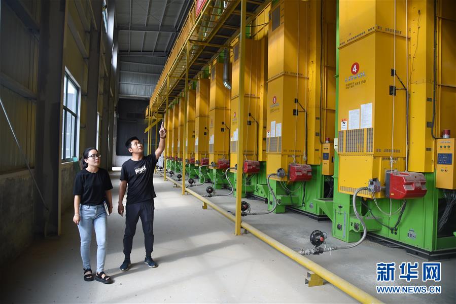 在山东省德州市平原县的农场里,杨春雷(右)和卜璐璐在烘干车间查看引进的高科技设备——低温循环式谷物干燥机(8月22日摄)。 新华社记者 王凯 摄