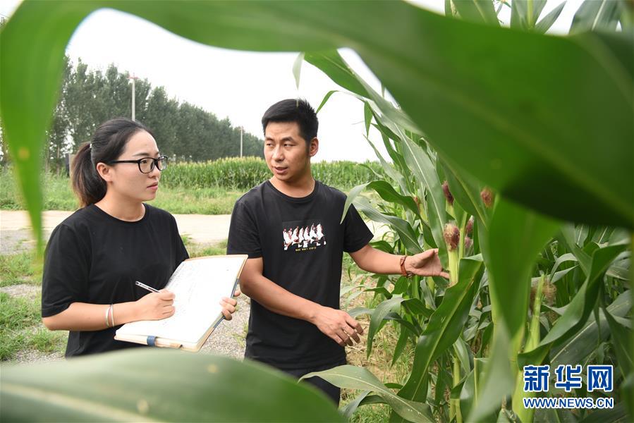 在山东省德州市平原县的农场玉米地里,杨春雷(右)和卜璐璐查看玉米的长势并监测病虫害状况(8月22日摄)。 新华社记者 王凯 摄