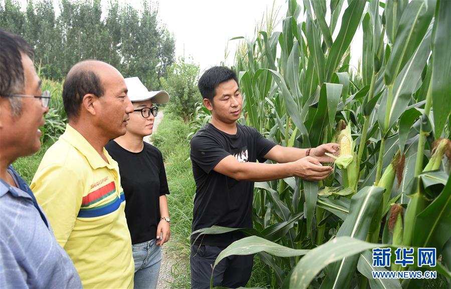 在山东省德州市平原县的农场玉米地里,杨春雷(右一)、卜璐璐(右二)指导当地农户学习有关科学种植的知识(8月22日摄)。 新华社记者 王凯 摄