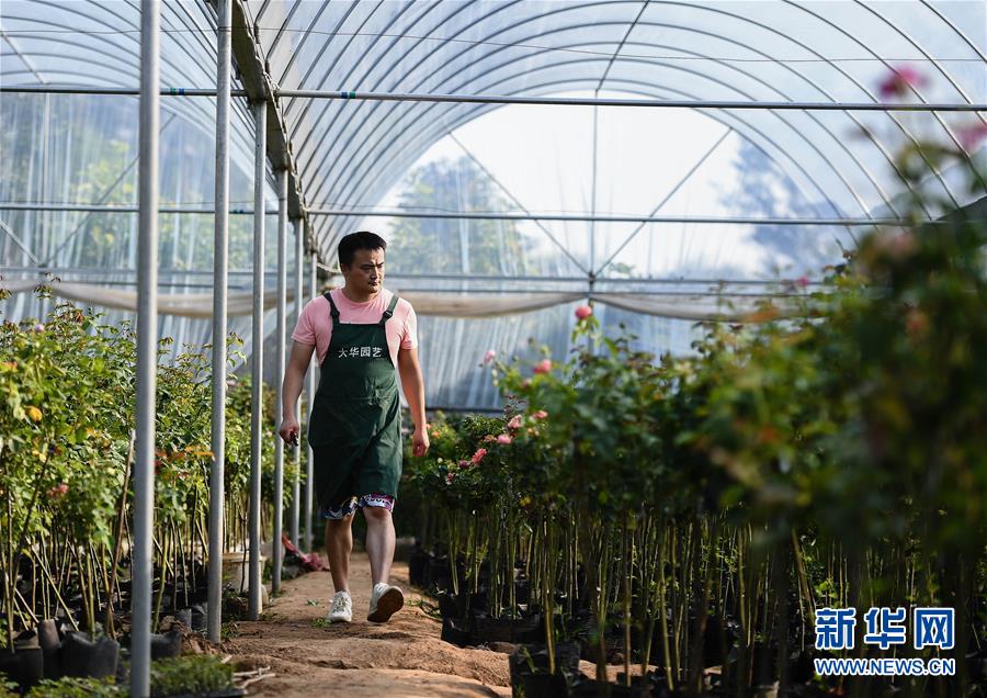 在沭阳县新河镇新槐村,张炎在花卉大棚内查看月季花长势(8月24日摄)。 新华社记者 李响 摄
