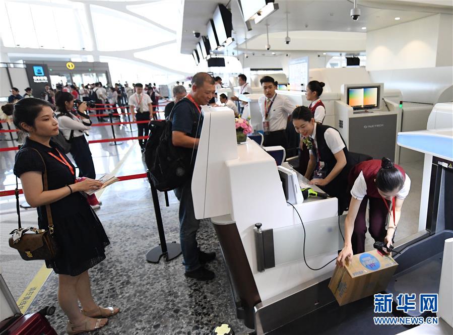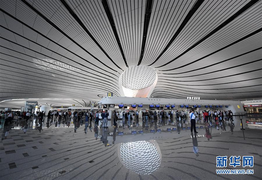 9月25日,中国南方航空公司的CZ3001次航班从北京大兴国际机场起飞。当日,北京大兴国际机场正式通航。北京大兴国际机场位于北京市大兴区和河北省廊坊市广阳区之间,与天安门直线距离为46公里,是目前全球建设规模最大的新建机场。新华社记者鞠焕宗摄