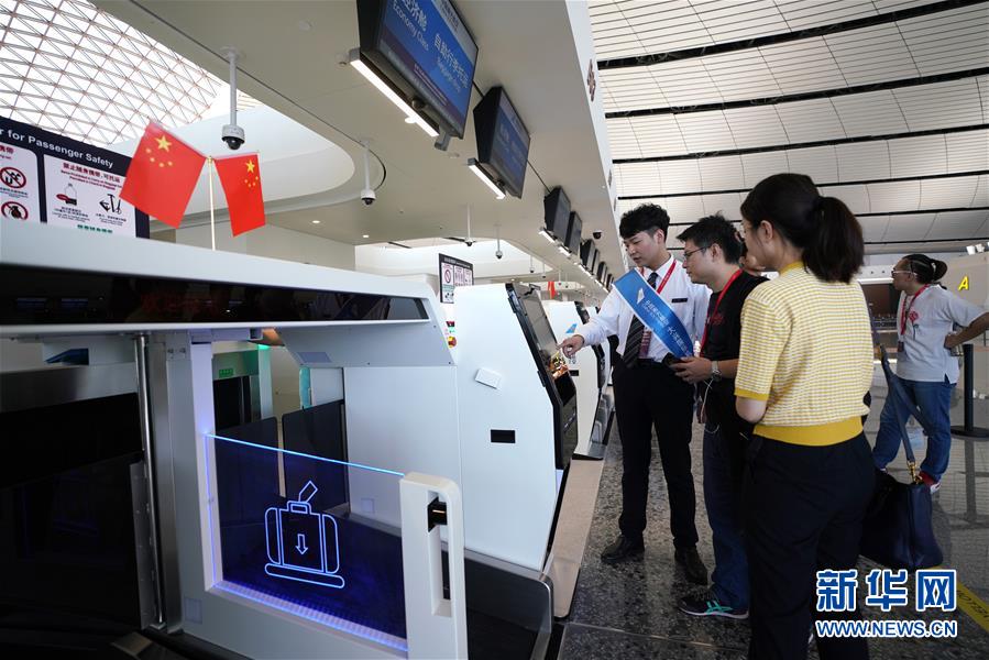 9月25日,中国南方航空公司工作人员(左)在北京大兴国际机场介绍自助行李托运设备。新华社记者鞠焕宗摄