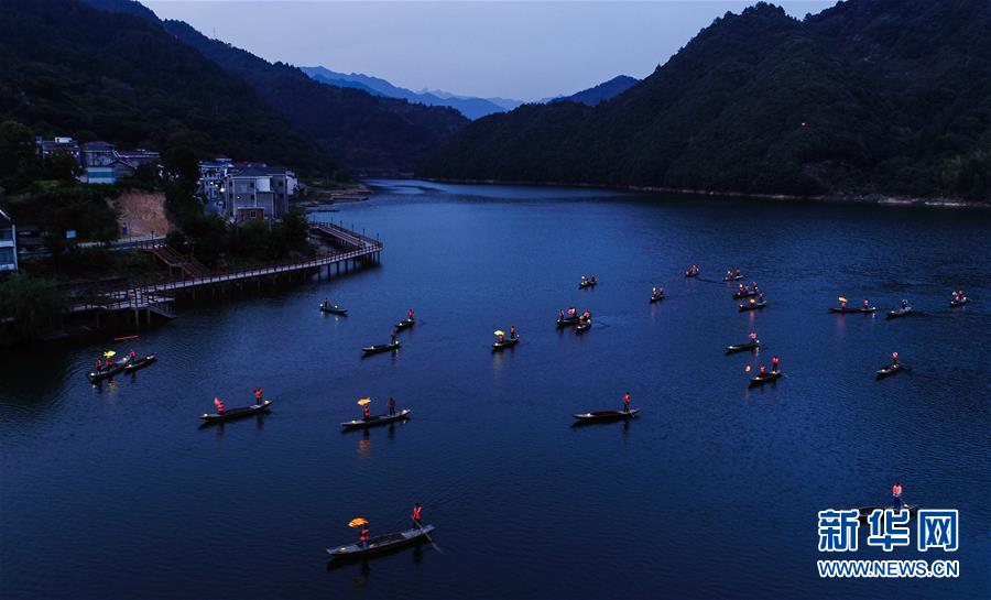 9月25日,在宋村乡云源港的水面上,渔民划着渔船,船头点亮渔灯,构成一幅“渔舟唱晚、万家灯火”的美丽图景(无人机拍摄)。 近年来,浙江省杭州市淳安县宋村乡积极发展乡村旅游,打造渔家元素特色景观,助力乡村振兴建设。目前,宋村乡依托山水景观和渔家文化,带动了当地精品民宿和集沙滩嬉水、自助烧烤、农事体验、民俗摄影采风为一体的特色旅游发展。2019年1月初至7月底,全乡接待游客10万人次,实现旅游经济收入1300万元。 新华社记者 徐昱 摄