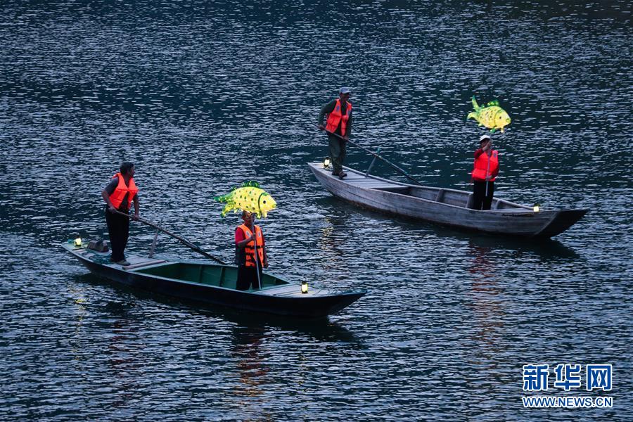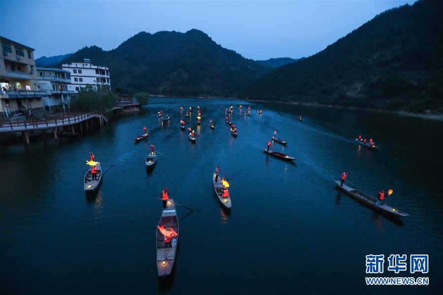 9月25日,在宋村乡云源港的水面上,渔民划着渔船,船头点亮渔灯,构成一幅“渔舟唱晚、万家灯火”的美丽图景(无人机拍摄)。 近年来,浙江省杭州市淳安县宋村乡积极发展乡村旅游,打造渔家元素特色景观,助力乡村振兴建设。目前,宋村乡依托山水景观和渔家文化,带动了当地精品民宿和集沙滩嬉水、自助烧烤、农事体验、民俗摄影采风为一体的特色旅游发展。2019年1月初至7月底,全乡接待游客10万人次,实现旅游经济收入1300万元。 新华社记者 徐昱 摄