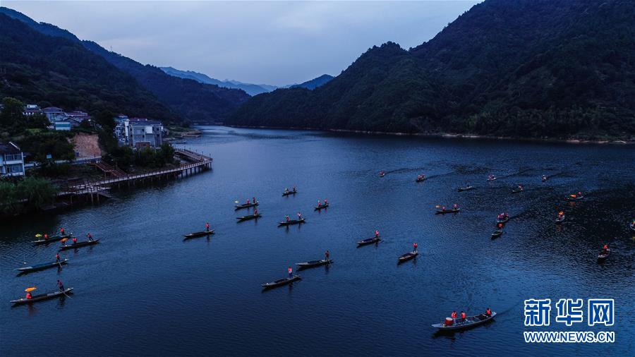 9月25日,在宋村乡云源港的水面上,渔民划着渔船,船头点亮渔灯,构成一幅“渔舟唱晚、万家灯火”的美丽图景,与沿湖民宿群落交相辉映(无人机拍摄)。 新华社记者 徐昱 摄