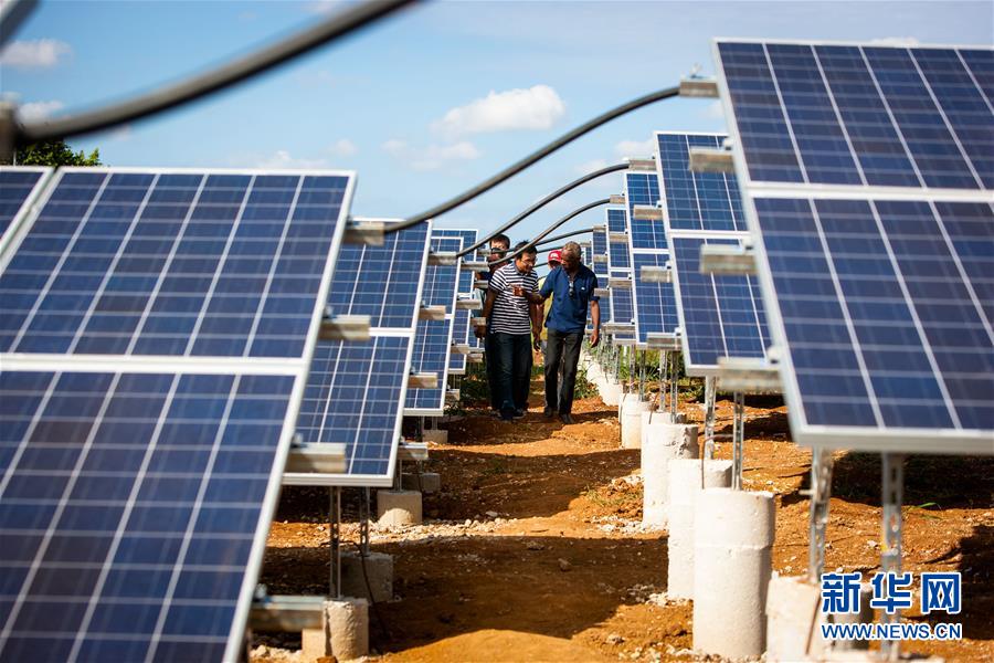 2013年11月3日,中古双方施工人员在古巴首都哈瓦那市郊的展览中心园区的中国援建的光伏电站内工作。2013年11月4日,由中国北京控股集团有限公司捐建的古巴1兆瓦光伏电站正式并网发电。该项目为中古合作共建,中方提供设备及技术指导。新华社记者刘彬摄