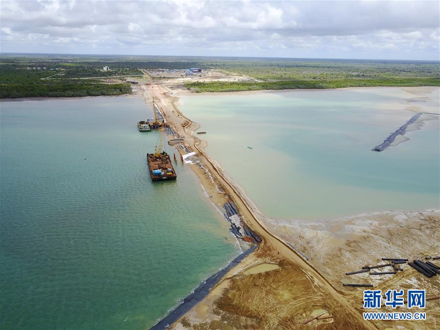 这是2017年5月10日在肯尼亚东北部曼达湾海域拍摄的拉穆港项目的引堤,引堤将大陆与人造陆地连在一起。2012年3月,肯尼亚联合南苏丹和埃塞俄比亚启动了“拉穆港-南苏丹-埃塞俄比亚交通走廊”项目。项目包括铁路、公路和石油管线等诸多组成部分,总投资额约250亿美元。同年,中国交建从17家通过资格预审的国际公司中脱颖而出,获得拉穆港项目的承建权。新华社记者潘思危摄