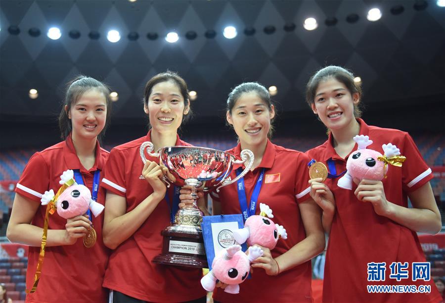 9月29日,中国队球员张常宁、朱婷、刘晓彤、李盈莹(从左至右)在颁奖仪式上合影。新华社记者贺灿铃摄