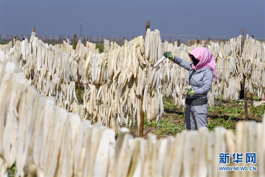 9月30日,宁夏吴忠市红寺堡区马渠生态移民安置区的农民在晾晒萝卜。新华社记者 冯开华 摄