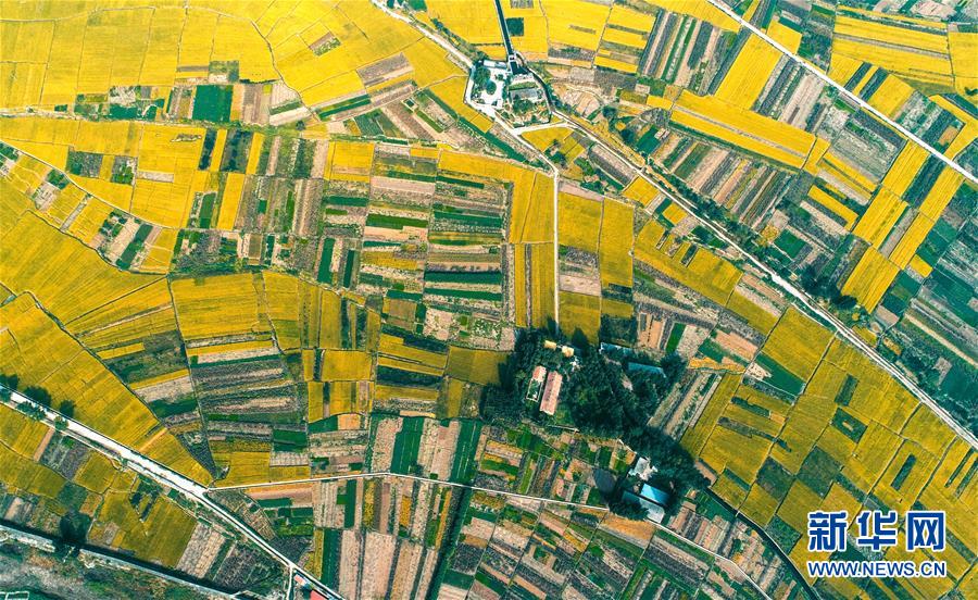 这是9月30日无人机拍摄的河北省涉县白芟村的稻田。 近日,位于太行山下的河北省涉县白芟村上千亩水稻逐渐成熟。从空中俯瞰,犹如一块块“调色盘”,美不胜收。 新华社记者 王晓 摄