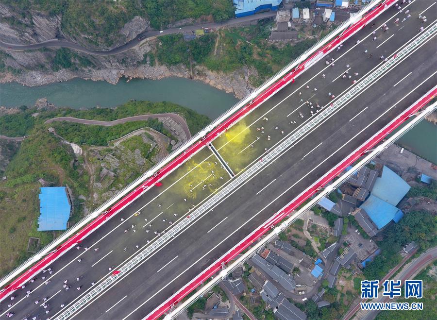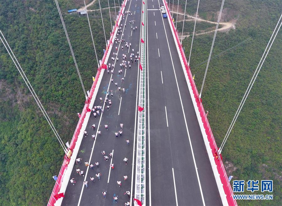 9月30日,赤水河大桥建设者以一场彩虹跑庆祝大桥建成(无人机摄)。新华社记者刘坤摄