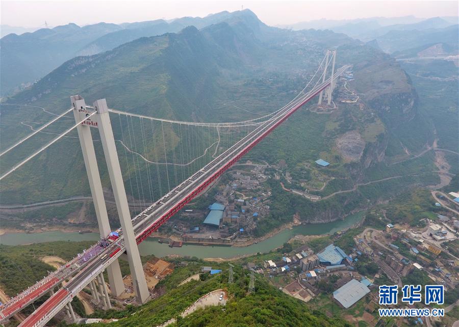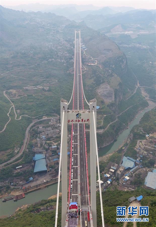 赤水河红军大桥全长2009米,主跨1200米,主塔高243.5米,在全国山区同类型钢桁梁悬索桥梁中排名前列,由四川省铁投集团投资、四川路桥集团承建,于2017年上半年开工。 新华社记者刘坤摄