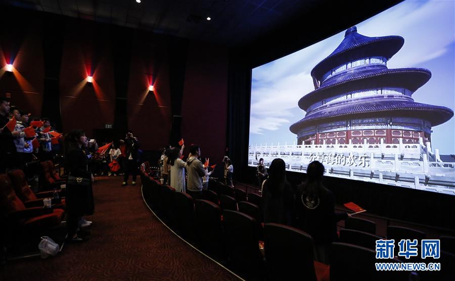9月30日,在美国洛杉矶,观众在电影《我和我的祖国》当地首映礼上合唱同名主题歌。新华社记者李颖摄