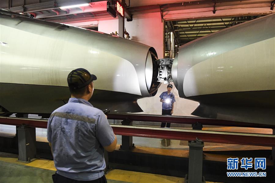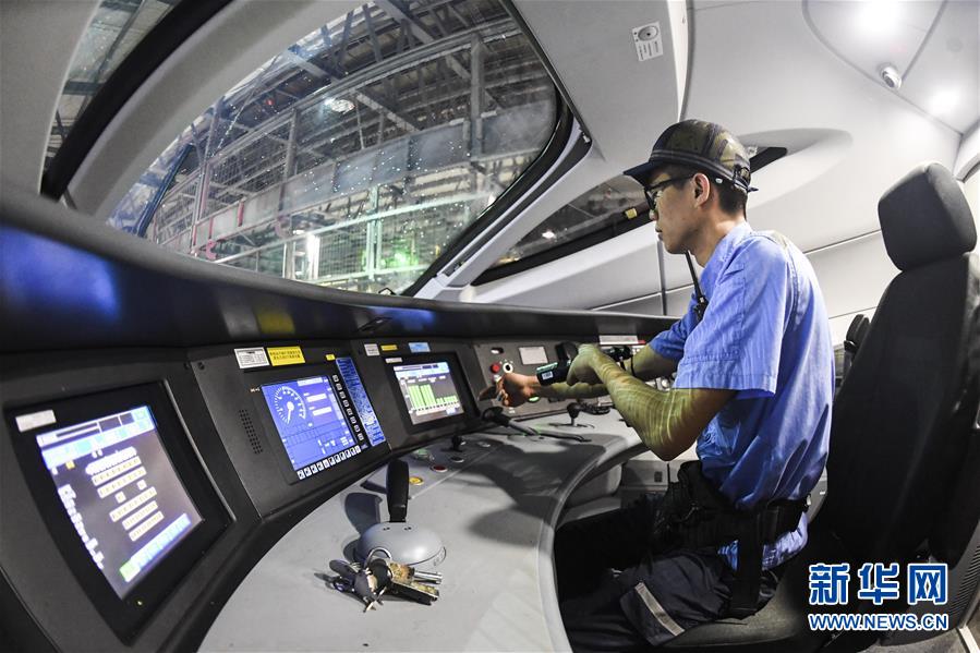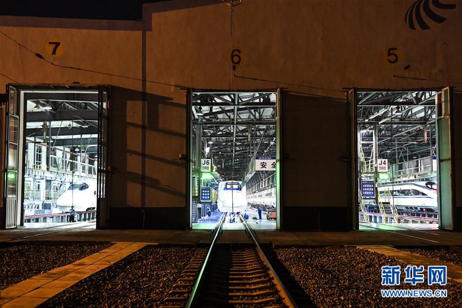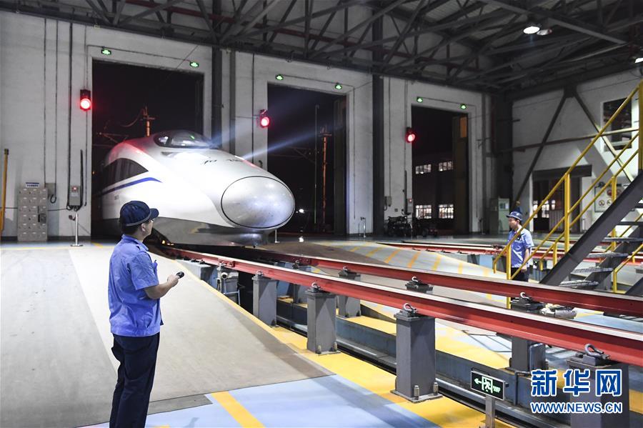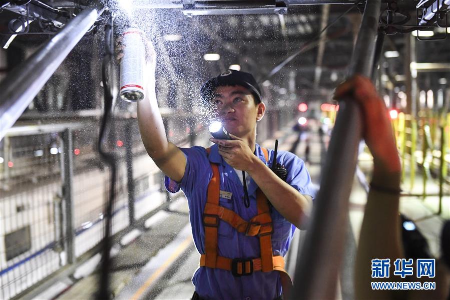 “动车医生”在进行动车组放电作业(10月2日摄)。 新华社记者 曹祎铭 摄