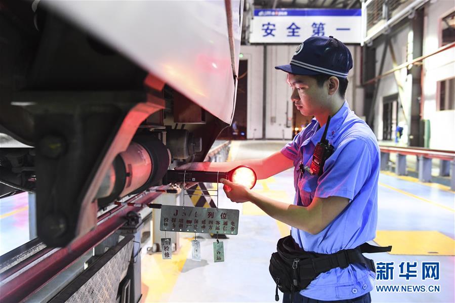 “动车医生”在南宁动车所检查库迎接列车(10月2日摄)。 新华社记者 曹祎铭 摄