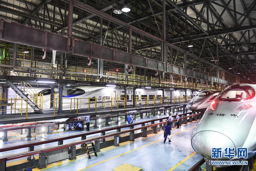 工人们在南宁动车所检查库内擦洗车辆(10月2日摄)。 国庆长假期间,动车、高铁开行密度较平时有所增加。当夜幕降临,随着一列列结束运营的动车、高铁陆续返回,中国铁路南宁局集团有限公司南宁车辆段南宁动车所检查库里的地勤机械师们也变得忙碌起来,他们像医生一样对列车进行全方位检修保养,确保车辆第二天可以正常运行。 新华社记者 曹祎铭 摄