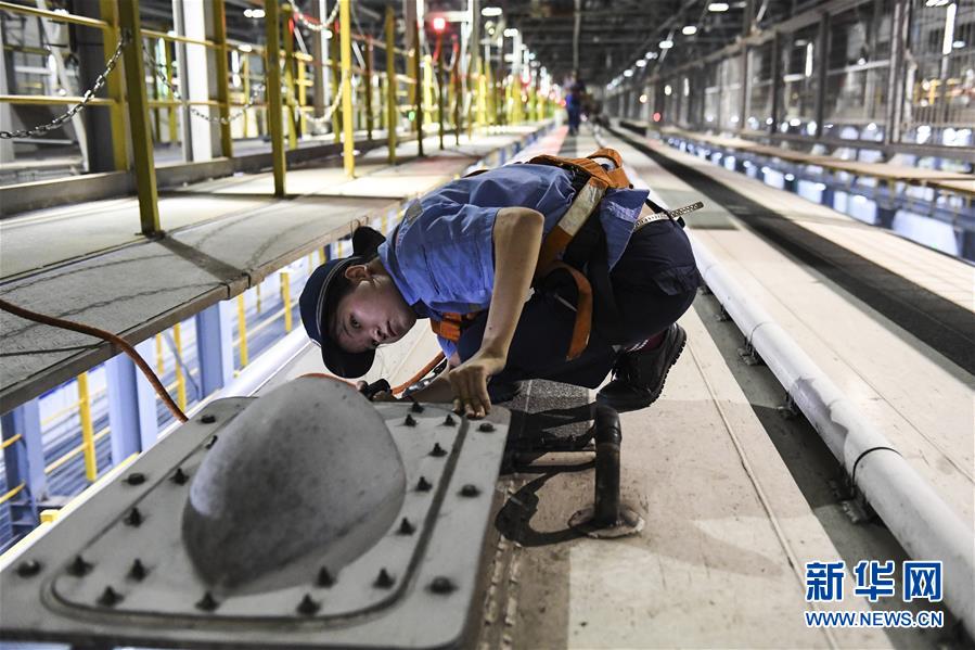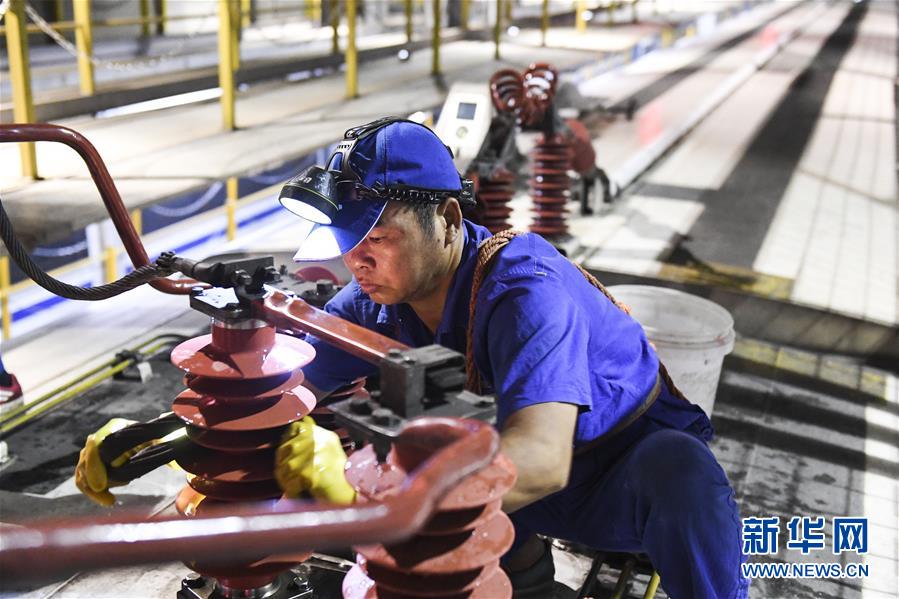 工人在擦洗车顶绝缘子(10月2日摄)。 新华社记者 曹祎铭 摄