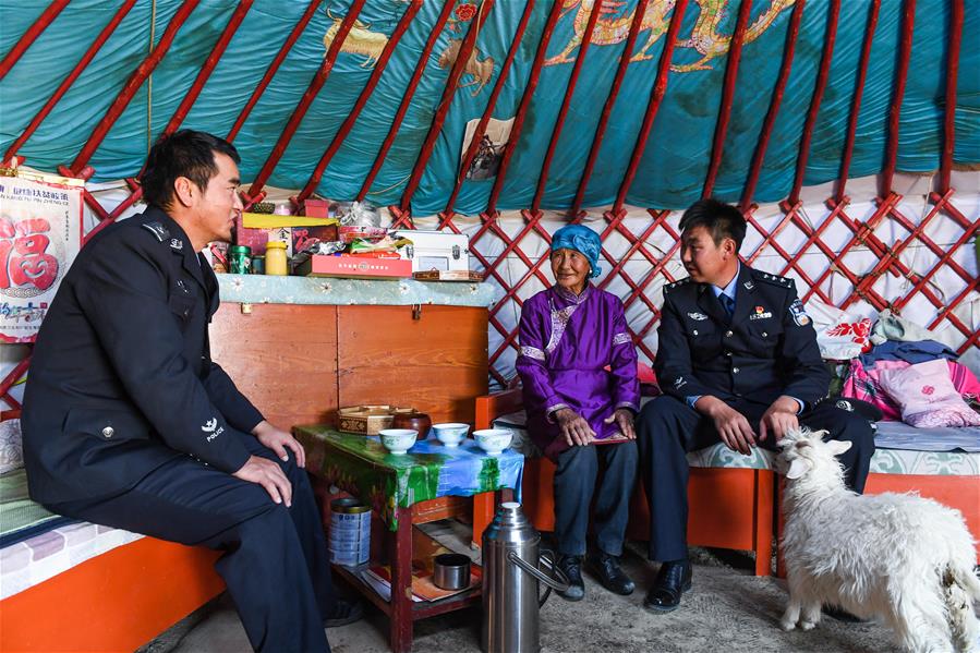 9月27日,内蒙古自治区额济纳旗算井子边境派出所民警走访看望牧民苏伊勒图雅(中)。新华社记者刘磊摄