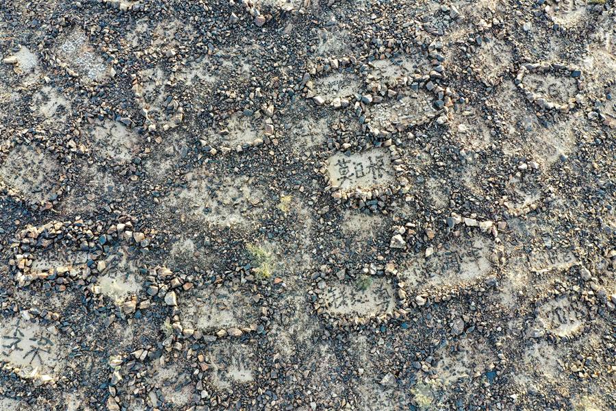 这是内蒙古自治区额济纳旗算井子边境派出所民警在大红山上用石块摆成的姓名和各种字样(9月27日无人机拍摄)。新华社记者刘磊摄