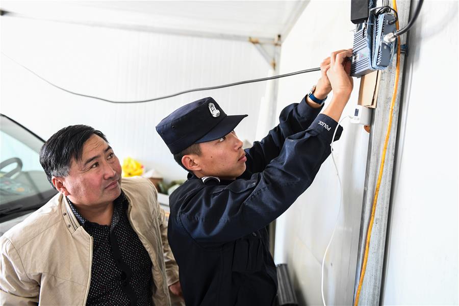 9月26日,内蒙古自治区额济纳旗算井子边境派出所民警在牧民家处理协调一起羊群纠纷事件。新华社记者刘磊摄