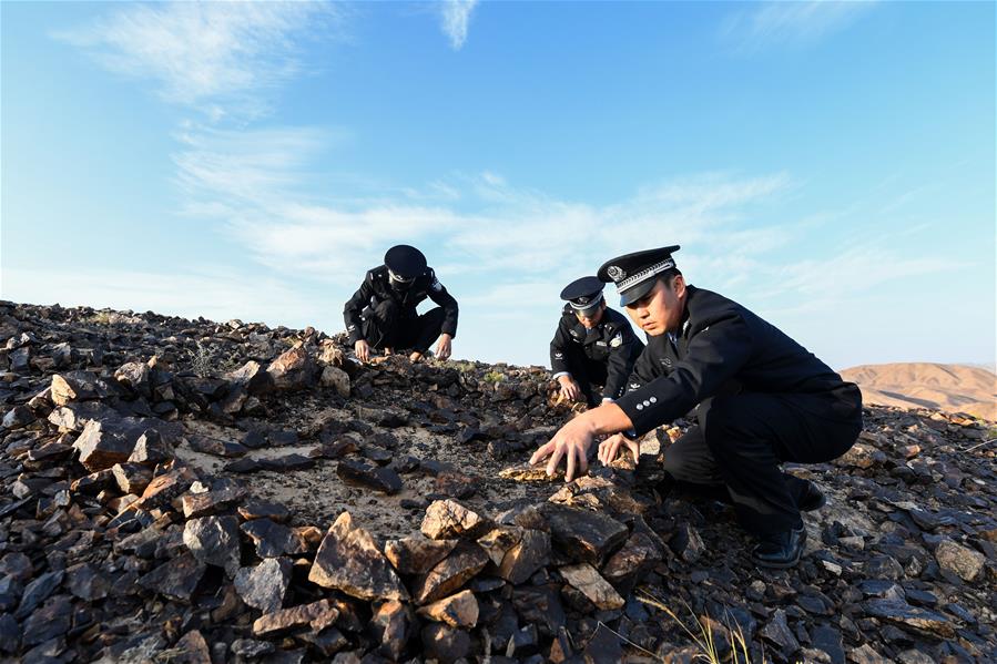 9月27日,内蒙古自治区额济纳旗算井子边境派出所民警在大红山上维护整理石块。新华社记者刘磊摄