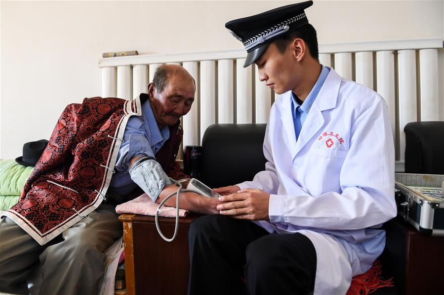 9月25日,内蒙古自治区额济纳旗算井子边境派出所的卫生员陈亚伟(右)给牧民党德尔进行体检。新华社记者刘磊摄