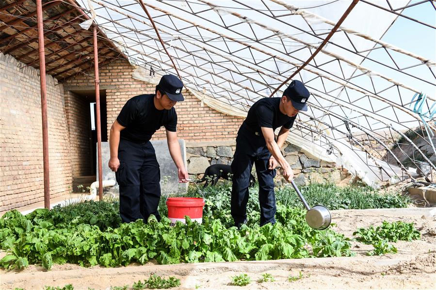 9月27日,内蒙古自治区额济纳旗算井子边境派出所民警崔现浦(右)和阿拉塔纳在派出所大棚里给蔬菜浇水。新华社记者刘磊摄