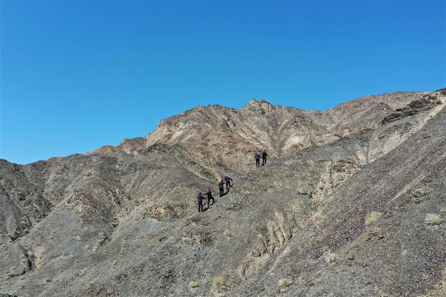 9月25日,内蒙古自治区额济纳旗算井子边境派出所民警登山进行巡护。新华社记者刘磊摄