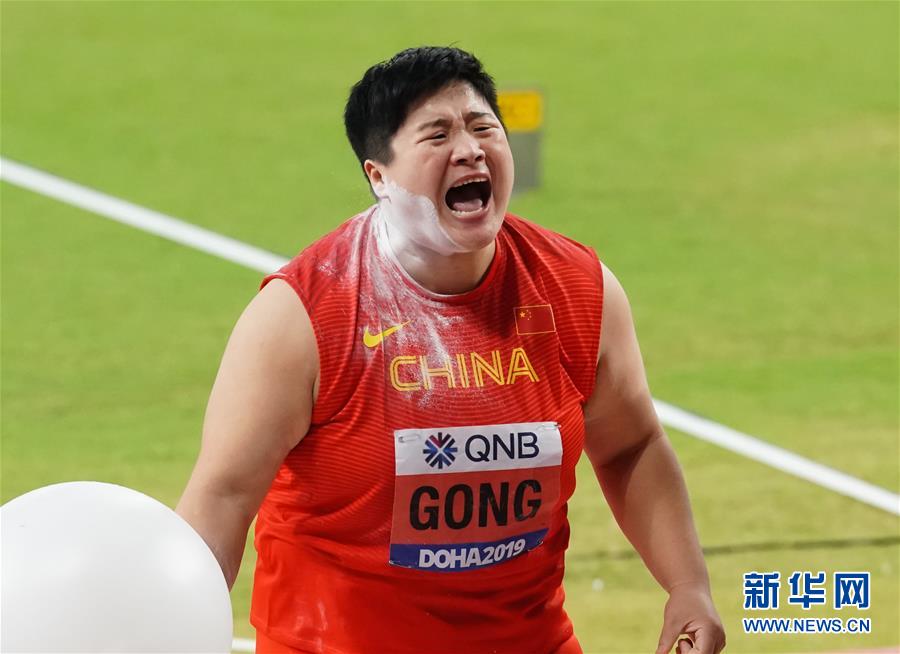 当日,在卡塔尔多哈举行的2019国际田联世界田径锦标赛女子铅球决赛中,卫冕冠军、中国选手巩立姣以19米55的成绩夺得冠军。 新华社记者王婧嫱摄