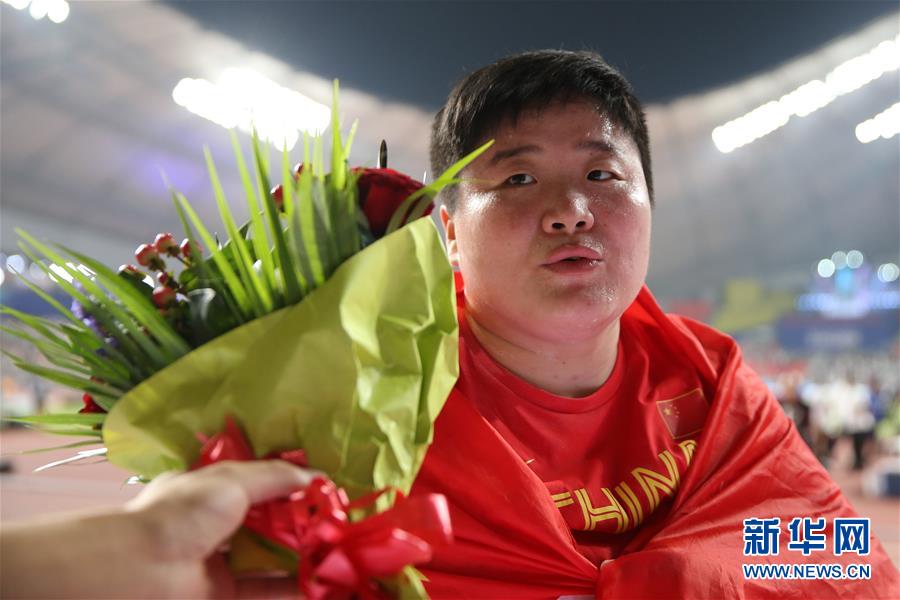 当日,在卡塔尔多哈举行的2019国际田联世界田径锦标赛女子铅球决赛中,卫冕冠军、中国选手巩立姣以19米55的成绩夺得冠军。 新华社记者李明摄